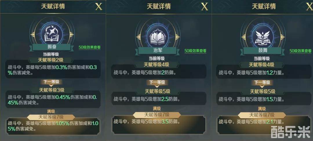 其中四个天赋里面有三个为通用天赋,分别为:振奋、治军、鼓舞。