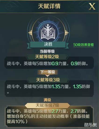另外一个天赋“决胜”是附带特殊效果的天赋,“决胜”点满级后,可以给英雄自带的技能或者英雄在战斗的过程中提供额外的增益效果。
