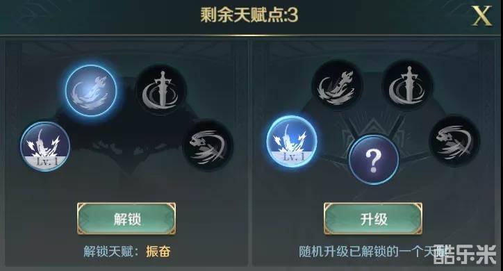 每升级一次天赋需要消耗一个天赋点,已点亮的天赋点升级的位置是随机的。此外,英雄觉醒时可获得四点天赋点,之后每两次进阶可获得四点天赋点。