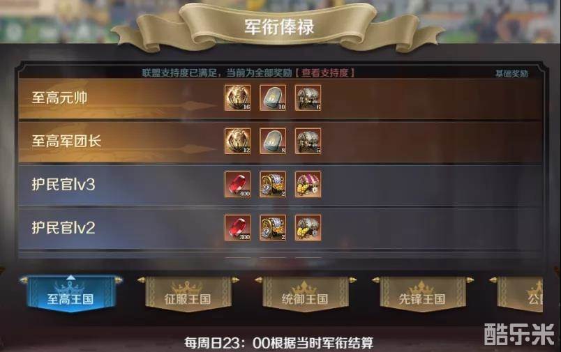 每周日23:00会根据当时军衔结算,通过邮件进行发放。