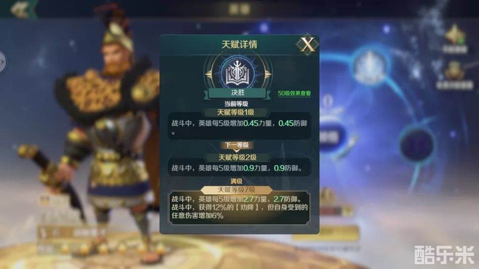决胜——第三天赋,7级额外效果,获得12%劝降(按输出的一定比例回复兵力),效果极好,但会增加自己受到的伤害。