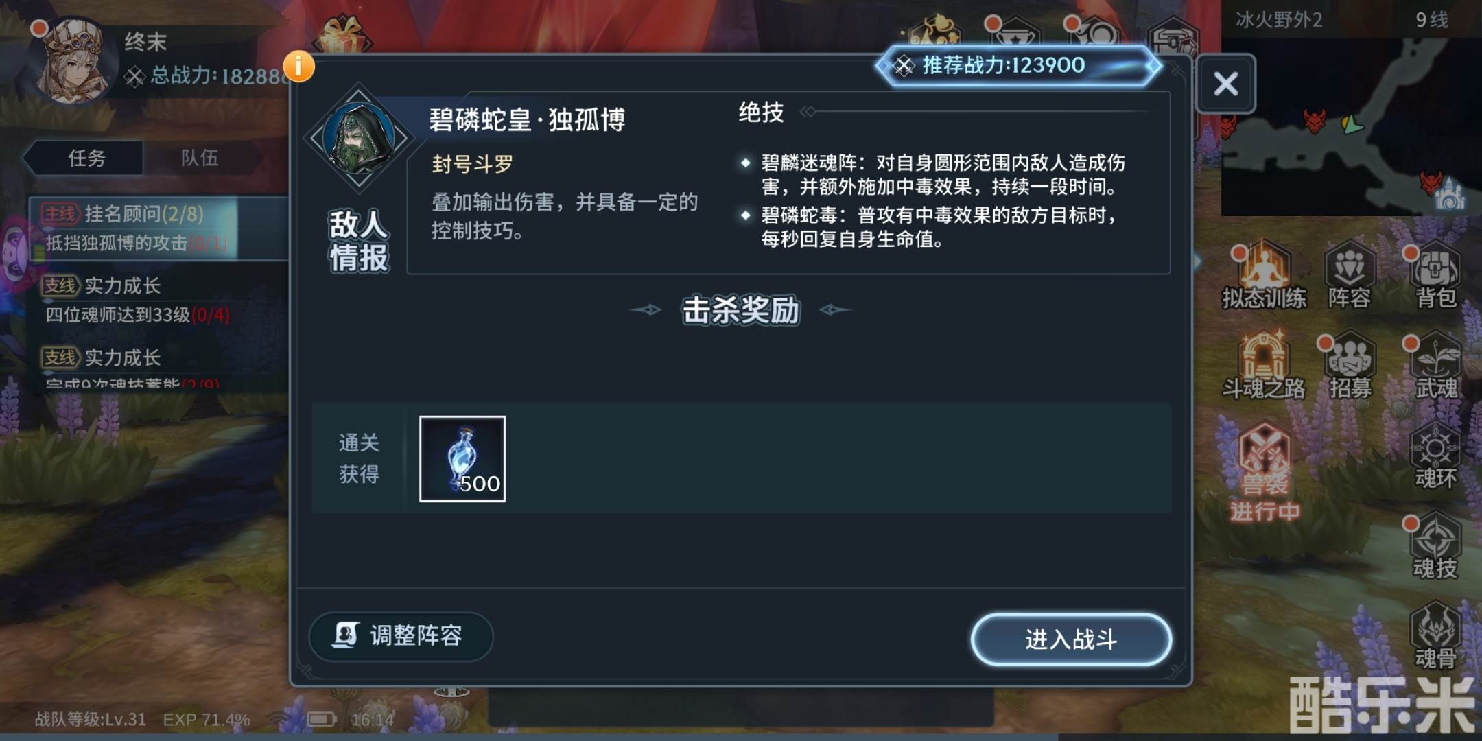 在独孤博出现之前还有两波小怪,玩家可利用小怪积攒能量值,等到独孤博出现后再用大招爆发。当独孤博生命值低于30%时,就会触发武魂真身:碧麟蛇皇,可短暂增强中毒和普攻伤害,此时用邵鑫的技能回血即可。