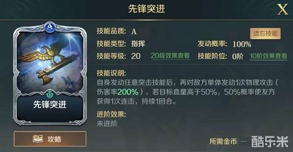 2、先锋突进是属于指挥技能,必然发动。它的效果是自身发动任意突击技能后,再对敌方单体发动1次物理攻击,若目标血量高于50%,则概率使友方获得1次连击。这个技能的核心之处是为友方带来关键的连击状态,提高友军输出。
