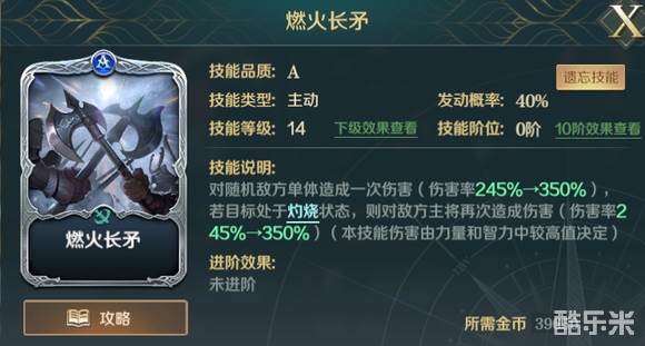 燃火长矛,新版本技能,对敌方单体曹成一次伤害,如果处于灼烧状态,则对主将再来一次伤害,满级700%倍率,能实现爆头,甚至比很多S技能都要强