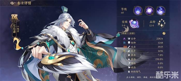 技能描述:左丘肃智绝千里,运筹帷幄,每当挥动手中羽扇,必然会破敌致胜,对敌方单体造成攻击力100%的普攻伤害。