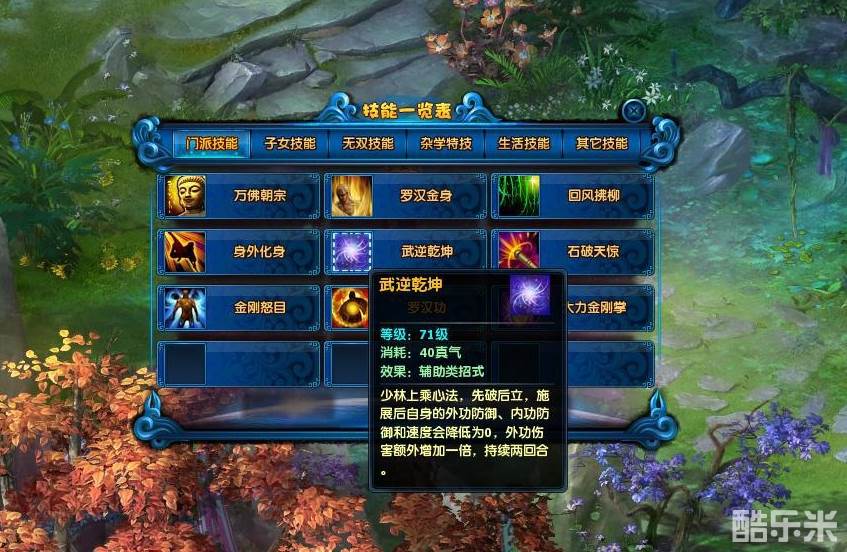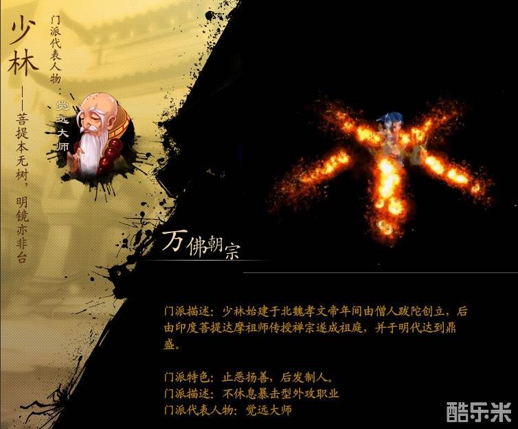 少林是对战技能以舍弃自身双防、速度为代价追求强大输出,务求一击毙命,是一个暴击型刺杀门派。“大力金刚掌”“石破天惊”立足高爆发一线!“万佛朝宗”保证了团战的AOE伤害,罗汉金身以气换生命弥补了防御成长上的不足,高攻高生存的门派特色更是一改传统的单一发展模式,多样化的战斗技能配合不同装备、加点,真正实现多线发展的培养模式。