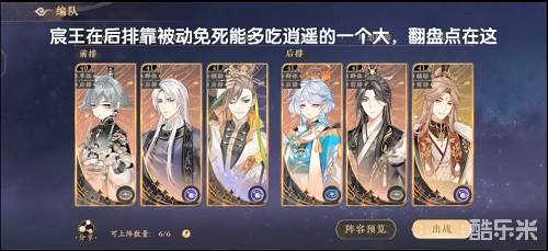 2、站位如图站位,千万不了站错了,站位也会影响对战结果,宸王放在后排靠对呗免死能多吃逍遥的一个大招,这是这个阵容的翻盘点,没有宸王可以换苏望夷。