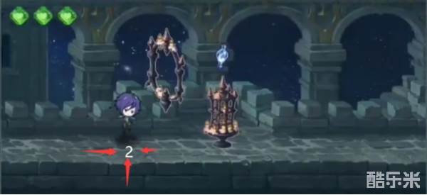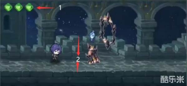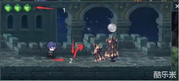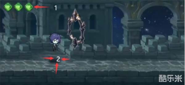 (1)遇到这类障碍物时:当角色达到2这个位置时,连续触屏两次,进行连跳即可通过