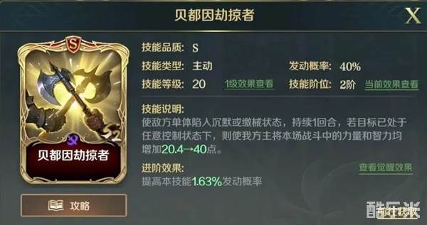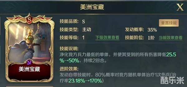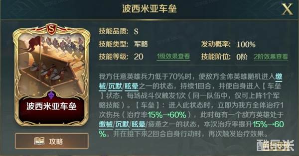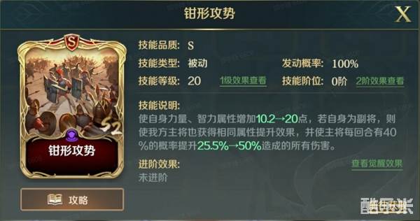 提升自身属性和主将属性,同时有概率提高主将伤害。这个技能非常适合辅助英雄,可以说是辅助英雄的万金油技能。