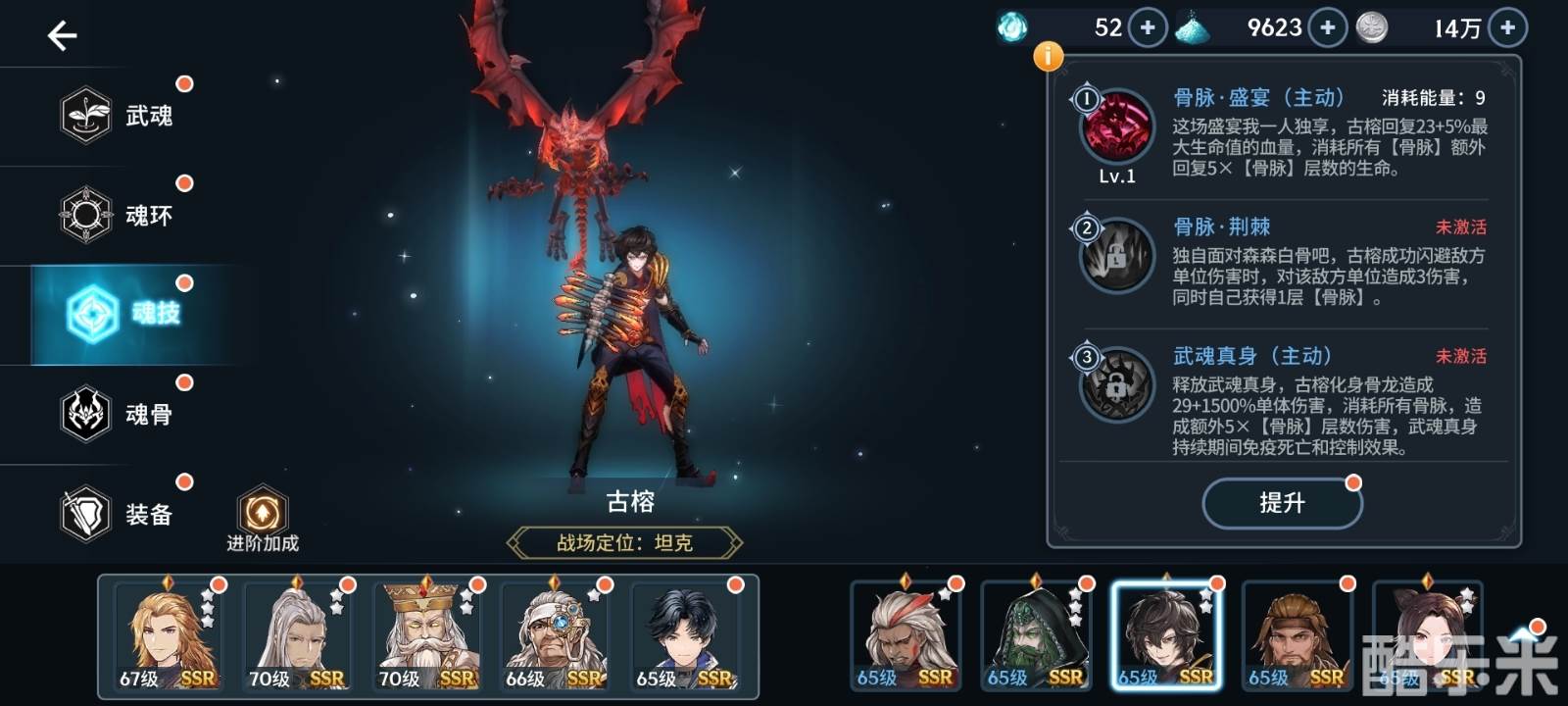 下面小编从技能方面对古榕的强度进行详细的分析。古榕的十个技能分别是骨脉盛宴,骨脉荆棘,武魂真身,化骨神龙,骨脉缴械,骨脉克敌,骨甲,白骨感应,盛宴之舞和本源骨种。古榕大部分魂技都围绕着骨脉产生,当古榕存在骨脉时就能够维持血量的稳定,骨脉的层数越多,回复的效果越明显。