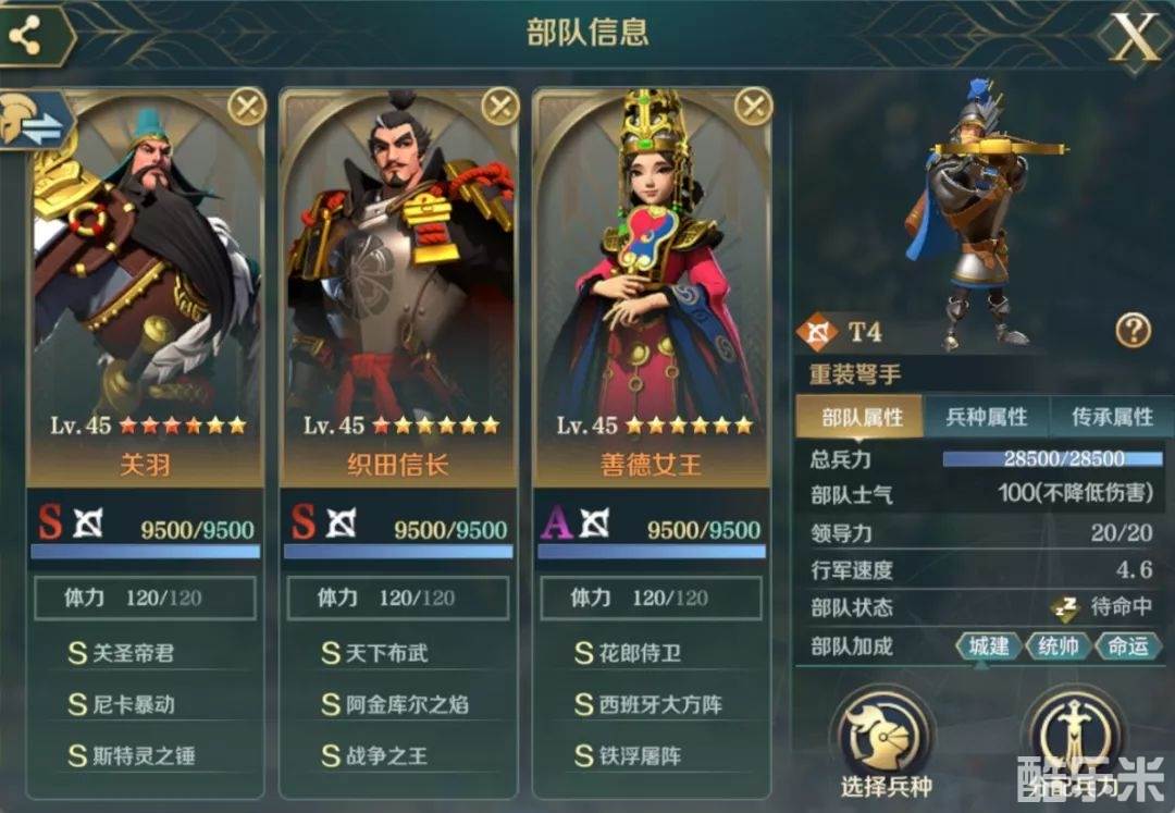 但是缺点就是太脆皮了,所以善德女王的作用就出来了,全场战斗提供被受伤害降低8%,还能免疫一次控制(使队伍有一个好的输出环境),且发动主动技能也会提供被受伤害降低16%的效果,搭配西班牙大方阵【前三回合,提供的被受伤害降低40%(满级)】和铁浮屠阵(提高队伍主动技能的发动率)就可以弥补队伍脆皮的缺点了。
