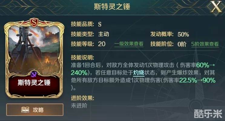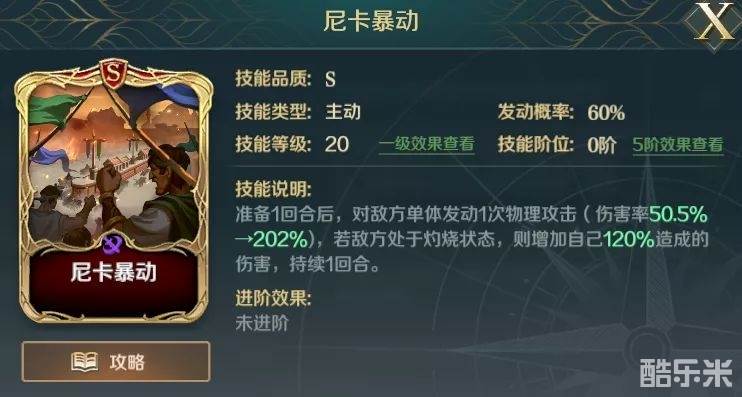 尼卡暴动则是打到灼烧状态的敌军,在造成伤害后可提高自身120%的伤害,配合斯特灵之锤则会在对敌军全体造成伤害后,再一次对所有敌军造成一次伤害,在技能的联动下打出爆发伤害。