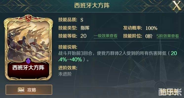 1)西班牙大方阵也可用斯巴达的壁垒替换,斯巴达的壁垒拥有整场战斗施加抵御的效果,对于有点脆的队伍也是很好的选择