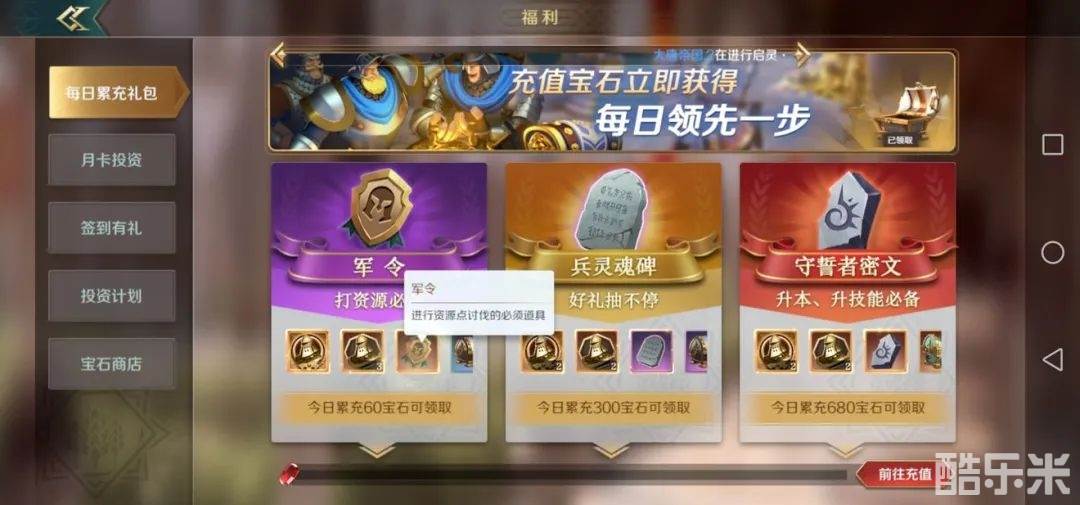 占领矿点会消耗军令,每天有免费的3个,另外每日累充充值到达一定额度,还会有额外的军令赠送。