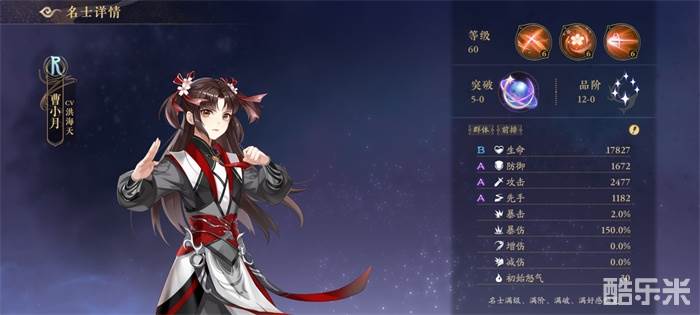 技能描述:曹小月提气蓄力,猛然前冲,重重挥出手中短刃,对敌方整列单位造成攻击力175%的怒攻伤害,获得2层傲气,每层傲气提升5%的伤害最多叠加5层。