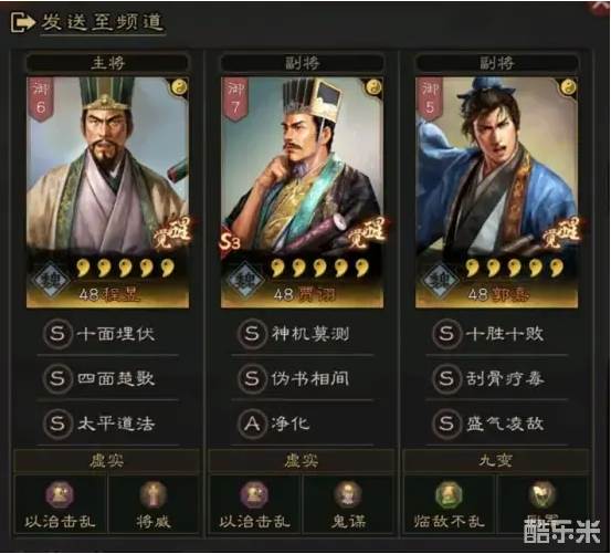 我们分别分析一下,非常规变种(1号);贾诩单核(2号);和程昱单核(7号)(其实这8队的思路是相近的,只是技能与将面略有差别)荀攸的【十二奇策】是可以增加发动率,相当于主动版的【白马义从】,是相当不错的。