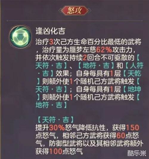 【天符·吉】:加怒气抗性、目标回怒、相邻回怒;对盾卡额外回怒