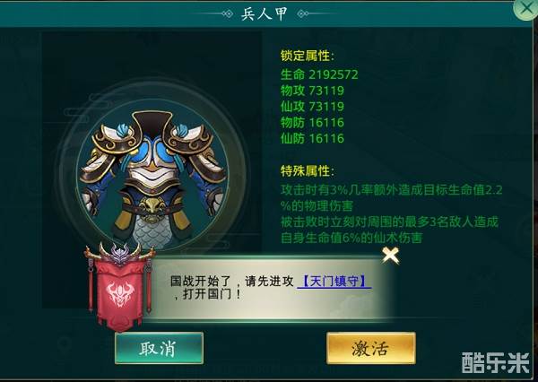 上仙们可以在国战开始时,装备兵人甲来提升自己的属性。