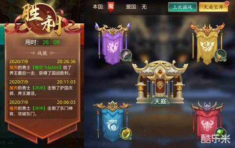 本国上仙们击败敌方界王后将获得国战胜利,获得丰富的奖励和国家贡献,还将获得对方的龙脉玺戒,开启更丰富的天庭宝库。如果半小时内未攻破敌方界王则防守国获得本次国战的胜利~