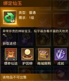绑定仙玉,是游戏里用途最广的货币之一,获取方式有很多。 1.商城限购,通过仙玉购买幸运仙玉可获得大量绑定仙玉; 2.成就奖励,达成相应成就即可获得大量绑定仙玉奖励; 3.在线礼包,累计在线即可领取福利礼包,可获得少量绑定仙玉 4.每日签到,即可获得绑定仙玉奖励,VIP4以上可获得倍数奖励 5.等级礼包,达成100、120、140级即可领取升级奖励礼包 6.首充奖励,每个仙玉价格的首次充值都会额外获获赠大量绑定仙玉 7.VIP专属特惠礼包,每级VIP福利礼包都可获得大量绑定仙玉 8.等级投资,投资888仙玉即可享受10倍超高额绑定仙玉返利; 9.月卡投资,投资300仙玉即可累计领取8倍绑定仙玉回馈; 10.限时活动-狂欢庆典、活跃有礼,达成活跃度条件即可领取100绑定仙玉,活跃度满1200可累计获得700绑定仙玉 11.护国英雄,击败敌国玩家,保卫本国王城即可获得丰厚绑定仙玉奖励 12.界王参拜活动,前往王城膜拜界王雕像即可活动一定量绑玉奖励 13.天帝参拜活动,前往天庭惨败立于世界顶端的强者,即可获得一定量绑玉奖励 14.修行问答活动,完成答题即可火灯丰厚的绑定仙玉奖励 |