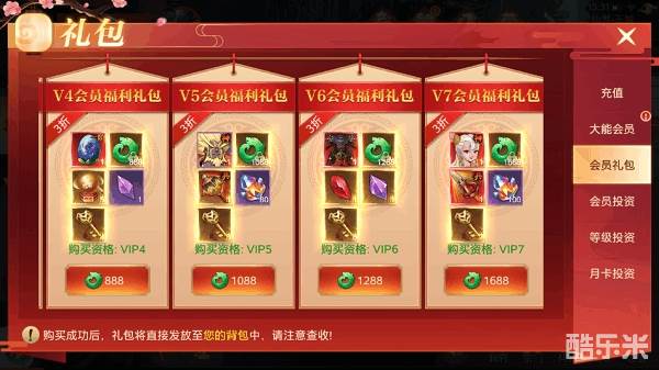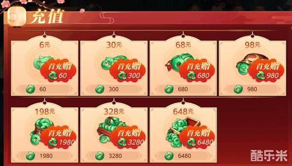 仙玉购买共分为7个档次,分别是6元购60仙玉、30元购300仙玉、68元购680仙玉、98元购980仙玉、198元购1980仙玉、328元购3280仙玉、648元购6480仙玉。