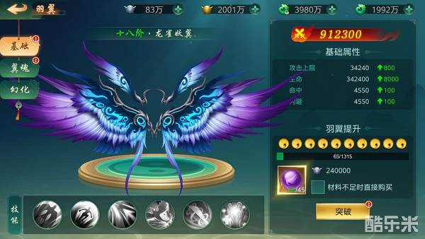 激活羽翼的幻化可以提高战力,升星后还可提高基本属性。