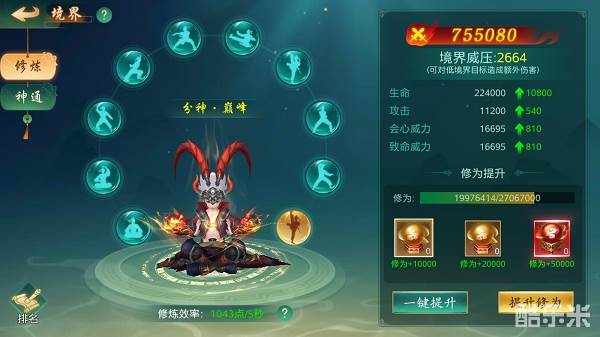 2.神通:提升修为的等级获得相应的增益,例如:生命上限、真气回复、对BOSS伤害加深等等。