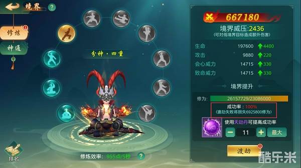 当前修为条满格时会提示是否渡劫,建议成功率100%再渡劫,不然会损失修为。