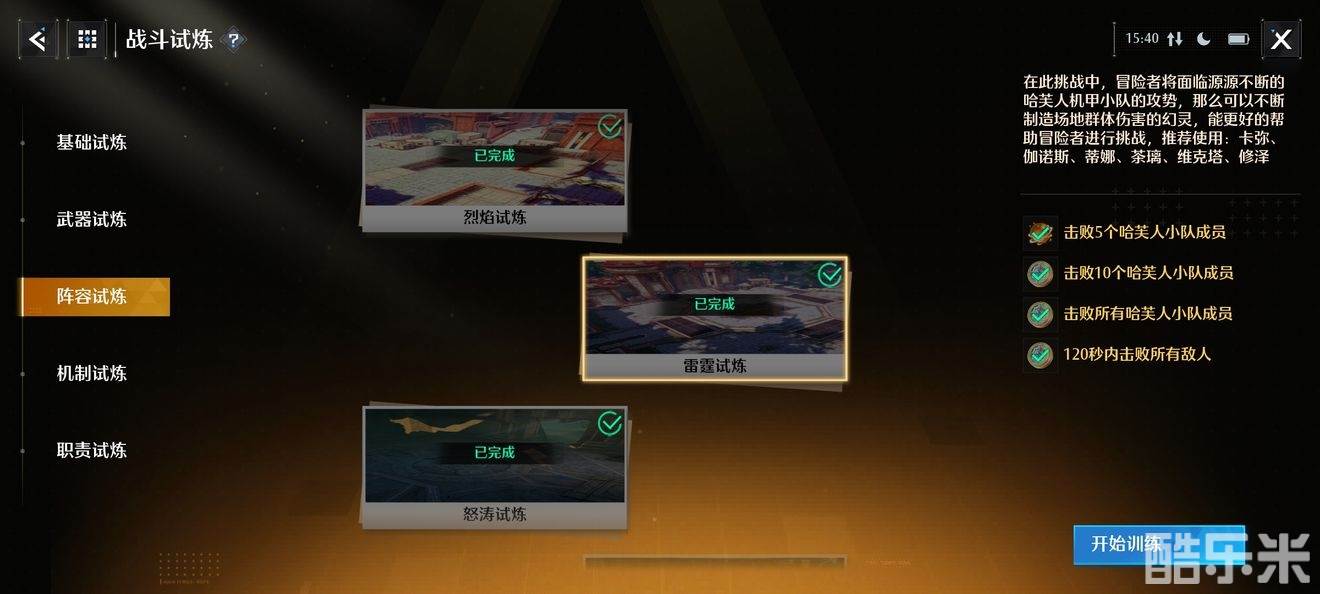 【雷霆试炼】是【战斗试炼】中难度比较适中的试炼,通关达成所有任务目标后,可获得150个传说幻灵卡弥的碎片和一些幸运硬币,首次完成基础条件——击败5个【哈弗人小队成员】通关还能获得经验,帮助我们更快升级。