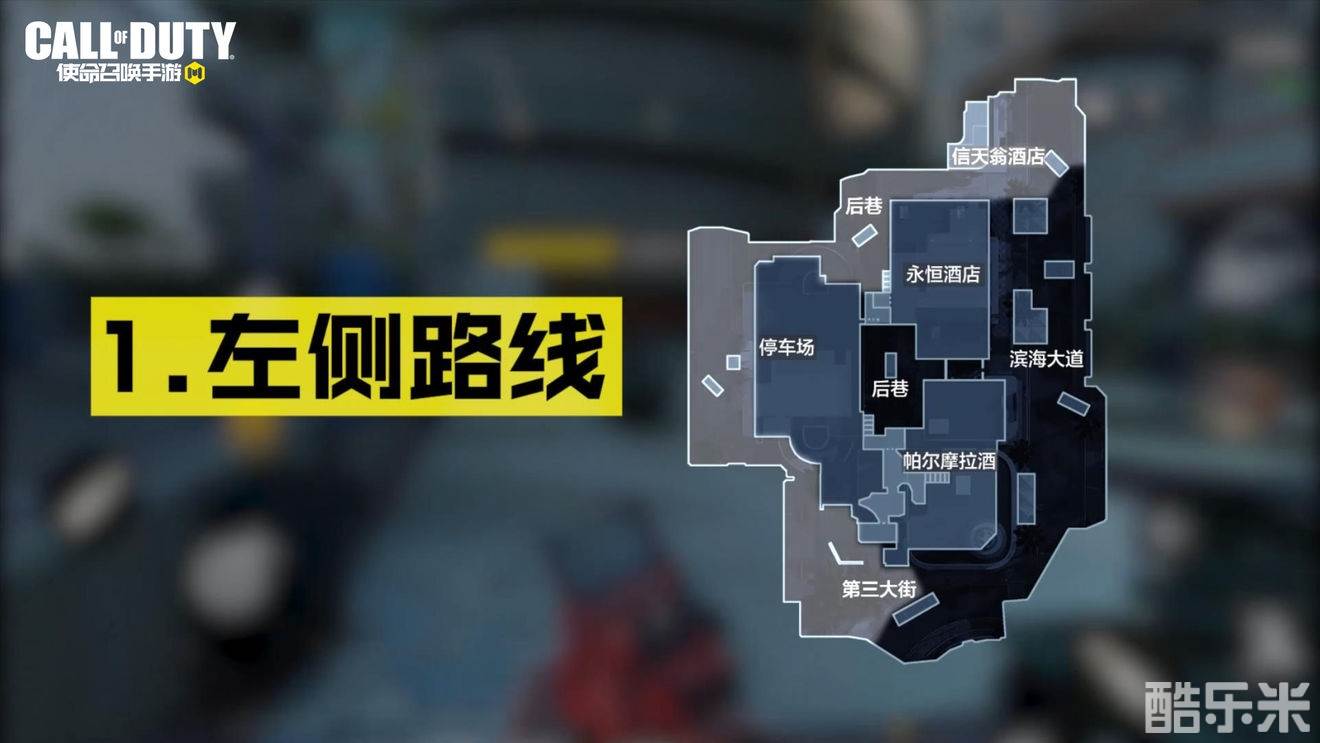 左侧道路位于场景外侧,战士们在这里可以穿过酒店停车场,进入后巷。需要注意的是,穿越停车场的道路转角较多,容易有敌人埋伏。