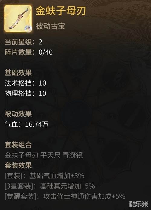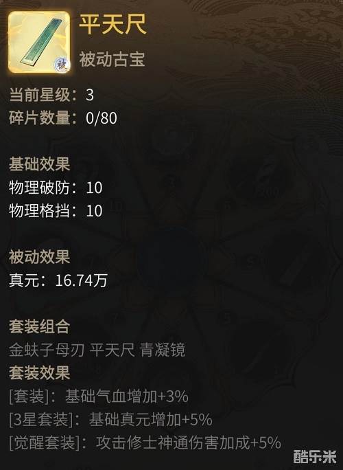 此宝乃万年瑶池仙玉熔炼而成,纳天地元气,能增强仙友物理破防和物理格挡,亦可为仙友提供真元加成。