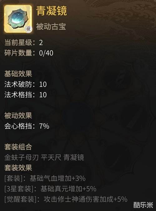 传说青凝镜取避月幽火炼制而成,它可为仙友提升法术破防、法术格挡,亦能提升会心格挡,是极佳的防御法宝。