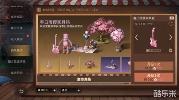 4月7日-4月28日8点,商队集市限时上架樱花地毯,樱花壁饰,大量暖樱家具装扮!此外,限时上架春日暖樱家具箱,打开有概率获得野餐吉他·樱,小熊樱樱,初恋樱花树等珍稀家具。一定不要忘记兑换精美家具哦!