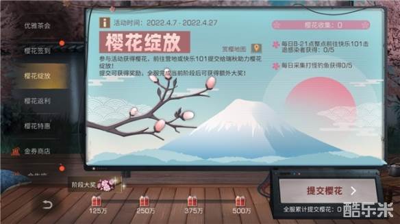 樱花绽放,全新任务如期而至。4月7日-4月27日期间,参与活动获得樱花并在营地以及快乐101提交给瑞秋,即可获得奖励并提升全服樱花开放进度。全服进度达到一定值时,可解锁阶段奖励。同时,部分地图将盛开樱花,欢迎幸存者前去赏樱!