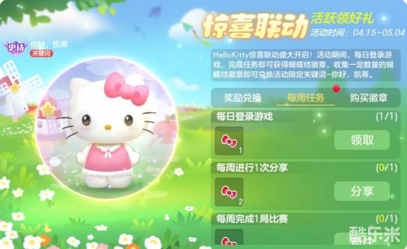Hello Kitty喜欢收集各式各样美丽可爱的小装饰品,尤其喜欢蝴蝶结。快来完成任务,帮助Hello Kitty收集蝴蝶结徽章吧,它不仅是好朋友之间友谊的见证,还可以兑换联动限定皮肤哦。