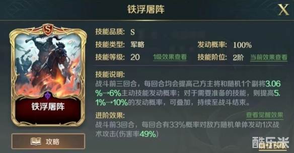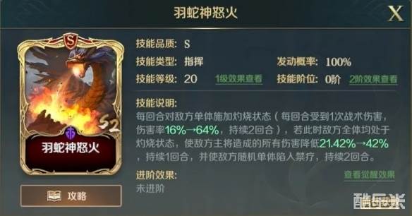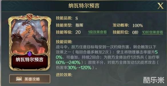先来看看他的自带技能【纳瓦特尔预言】。在敌方任意目标受到灼烧时,便会自动触发上述三种效果之一。其中最好的自然是提升物理暴击率的效果,一次50%,并且此效果可以叠加。也就是说,这个效果只要连续触发两次,便可以将主将的物理暴击率直接叠加到100%,从而大大增强主将的伤害爆发。但另外这个技能也有可能带来负面效果,即【敌我不分】,攻击我方全体。这一点我们可以通过少点智力来降低负面影响,使其造成的风险处于可接受范围内。