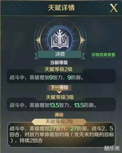 其核心天赋无疑是在2号位的【决胜】,满级能让其在战斗的2、5回合优先给敌方未灼烧目标点火。这个天赋不但能让其有更高概率触发自身技能,同时处在2号位的位置也让其相对较好培养。