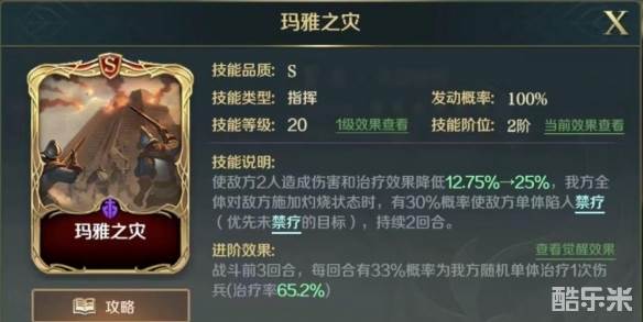 减伤减疗的强力效果不必再多说,并且我方对敌方施加灼烧时,还有概率触发禁疗效果。这个技能搭配【羽蛇神怒火】或【阿金库尔之焰】便可实现高覆盖禁疗,在当前版本治疗英雄和技能满天飞的环境下,能起到很好的克制效果。另外由于减伤效果可以叠加,【玛雅之灾】也可以搭配【设置拒马】实现大幅度减伤,为我方的主将提供更安全的输出环境。