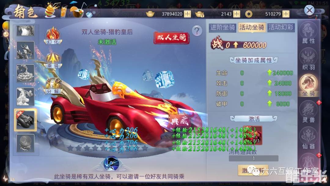 冠名礼包:双人坐骑-捷豹皇后(跑车)*1、典藏-蜂后(灵兽)*1"