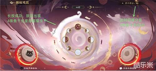 2、敲鼓按照逆时针进行。出现连续同色的小鱼干就需要长按对应颜色的鼓,长按成功会在鼓边显示猫猫虫进度计对应鱼干条数的分数