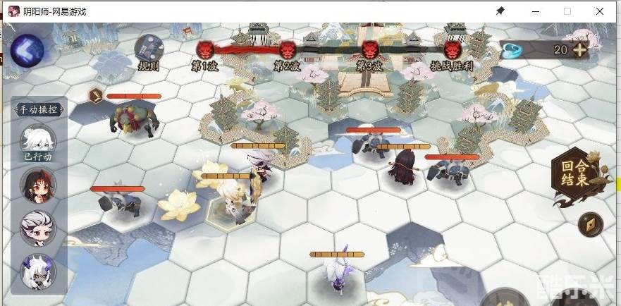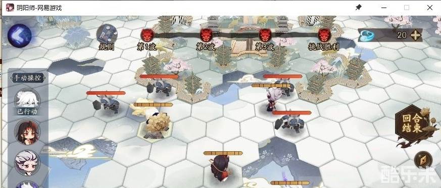 开局一键上阵,帝释天移动到两怪夹角下面一格放莲花,阿修罗原地待命,鬼吞移动到右侧两怪中间放技能,茨林走一走,第一波结束