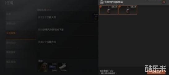 一是多跑几次农场地图,去地下室多摸摸,摸到够两个火药之后,点击任务进入任务界面,选择提交会弹出一个页面,选择红色火药,点击提交按钮,提交后就完成这个目标了