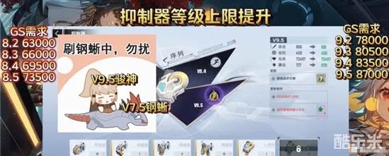 抑制器开放到了9.5,同时等级上限也来到了80级,8.5可以获得最后一个位置的西萝意志,而9.5最高级抑制器可以随机获得一个金引擎,所以按照钢蜥俊神理论来说,7.5将成为新钢蜥,9.5才是我们的俊神大圆满了。且最高的9.5抑制器需要战力也来到了8.7万,新装备拉满属性加的还得多点应该才能触碰到这个境界了;