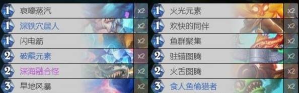 1费:深铁穴居人x2丨哀嚎蒸汽x2丨火光元素x2丨欢快的同伴x2丨鱼群聚集x2丨闪电箭x2