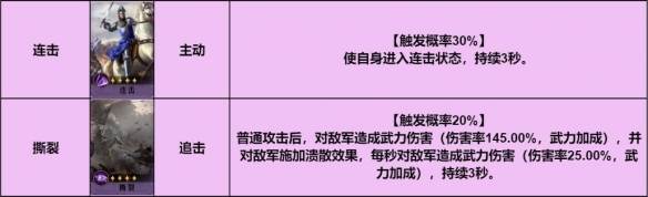 战阵之诗有着非常优秀的治疗率和伤害率,初期五星技能不多的情况下,可装配连击提升战阵之诗的优势,另外一个技能可选择撕裂过渡。