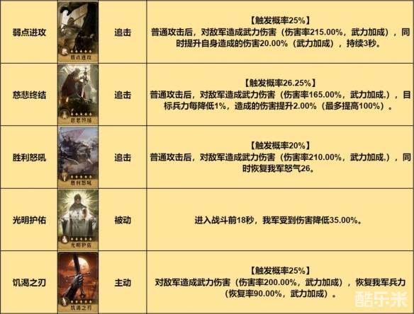 ● 魏兰:可增加武力输出的弱点进攻、输出能力更优越的慈悲终结,这两个技能均可用于替换怒涛之击。