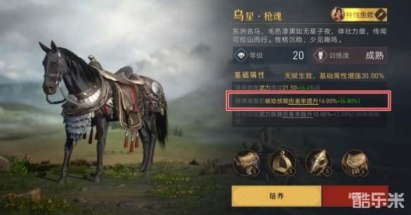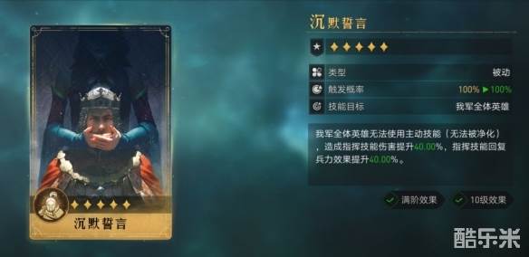 与之类似的例子还有很多,如指挥剑阵容中的尤利乌斯,原本伤害率只有150%的王者之剑,在经过沉默誓言(白板)、20级战马、6号天赋的全系列增幅后,伤害率将提升至230%,并且还是稳定9秒一次触发附带概率增伤,相较于平均15秒才能触发一次的天地无双斩,又是拉开了一段差距。
