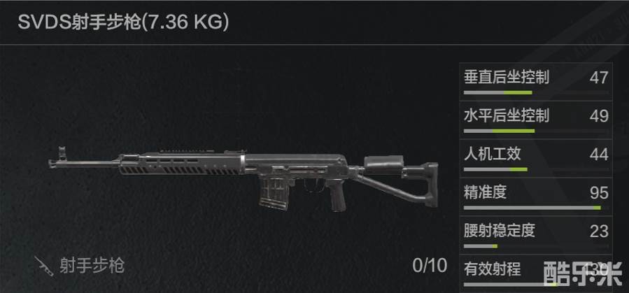 SVDS虽然是一把半自动开火模式的射手步枪,但区区100发/分钟的射速比起其它射手步枪要慢得多,实际使用起来更像是一个能连发、具备一定近战能力的莫辛,它使用的子弹也是与莫辛相同的7.62x54口径,威力还是很强的。由于可以加装前握把,在投入少量改装的情况下,即可拥有不错的人机工效,加装实惠的PSO1倍/4倍镜即可满足基本的作战需求。