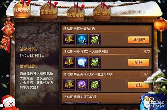 活动内容:活动期间完成任务可以获得包括大量元宝、金头盔配方、金灵石、开运竹在内的丰厚奖励!
