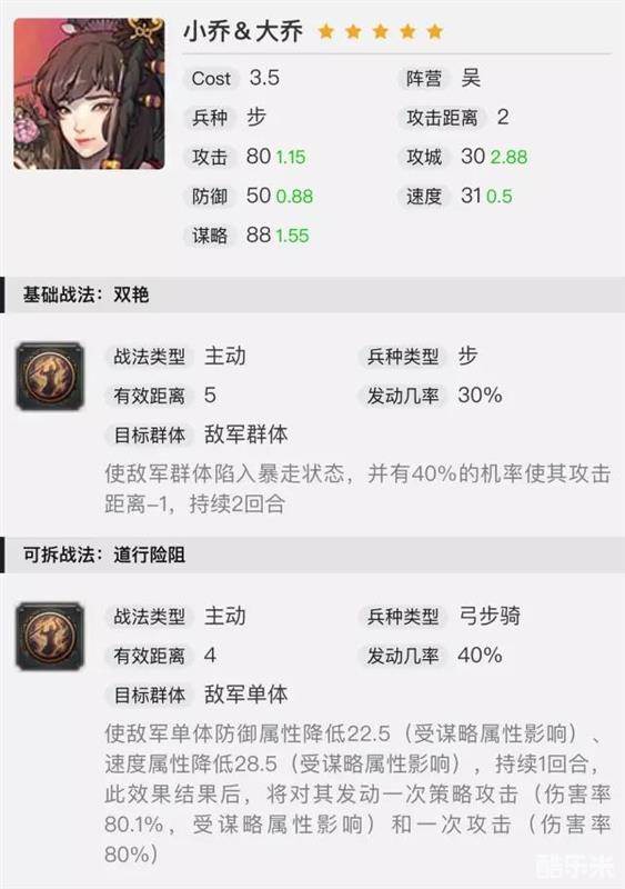 1.15的【攻击】勉强算是有普攻伤害;0.88的【防御】较低;1.55的【谋略】,女将里算是可以的。为什么这里不直接将谋略算成2.05呢,因为大小乔的加点并不固定,她的技能本身没有任何属性加成,可根据位置改变加点;0.5的【速度】算是慢速一族;【攻击距离】只有2,只能中军走起了;2.88的【攻城】成长,似乎是率土第一?为什么女将这么暴力!